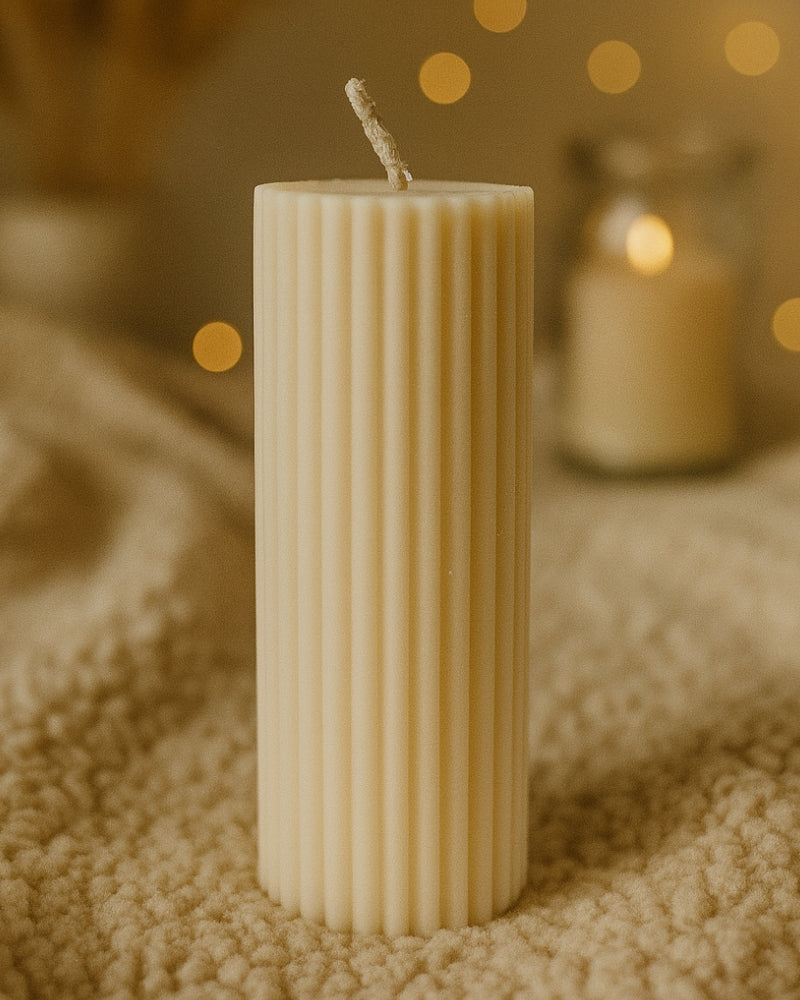 Una vela minimalista y elegante, diseñada en forma de cilindro con finas líneas acanaladas. Elaborada en cera de soya natural, es ideal para decorar con estilo, regalar o crear ambientes cálidos y sofisticados en cualquier espacio.