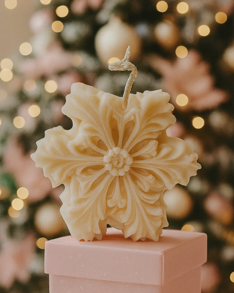 Una creación artesanal inspirada en la magia del invierno. Con forma de copo de nieve, esta vela hecha en cera de soya natural es ideal para decorar, regalar y llenar tus espacios de luz, frescura y encanto navideño.
