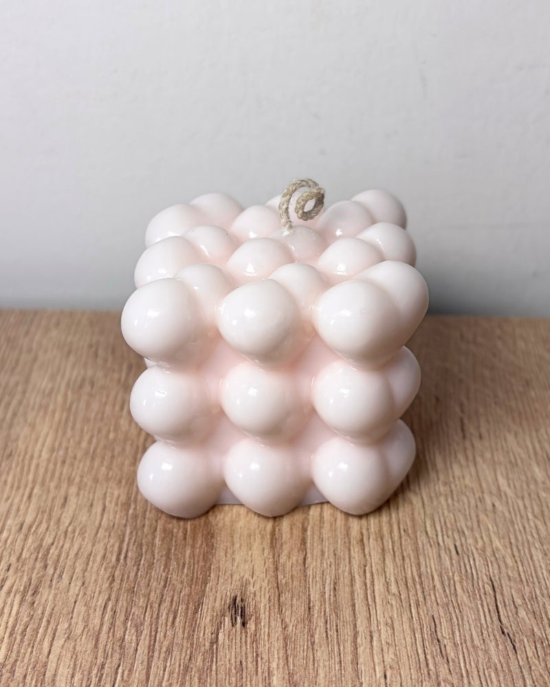 Una vela artesanal en forma de cubo con corazones en diseño 3x3. Hecha completamente en cera de soya natural y con pabilo de hilo, combina ternura y estilo minimalista.